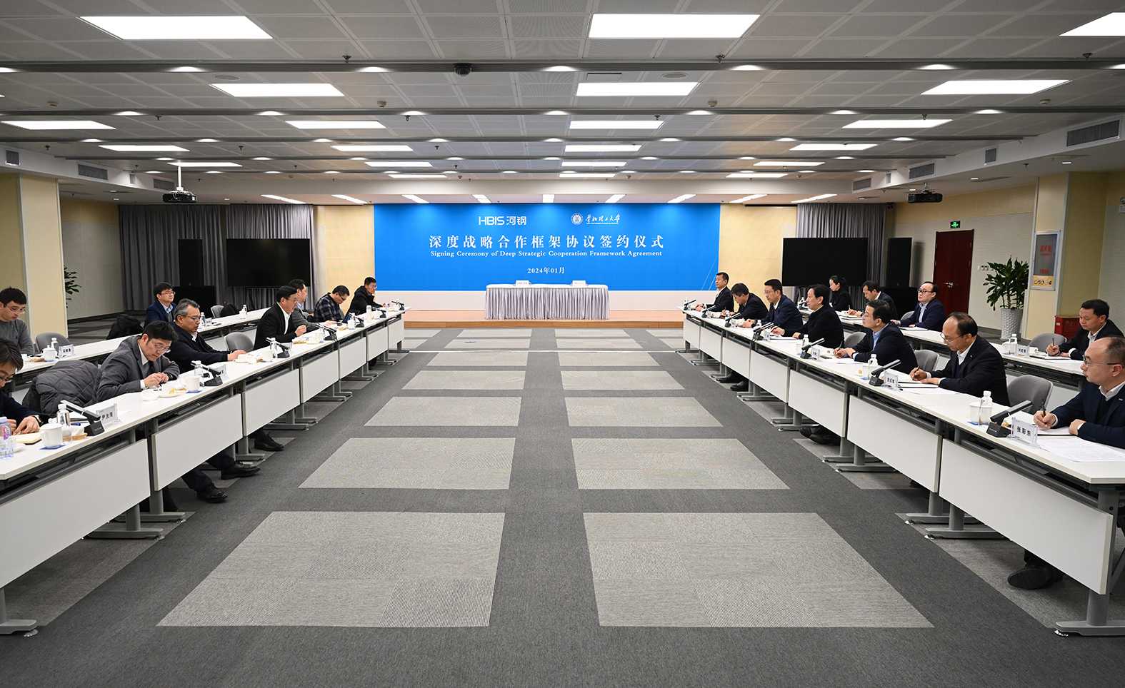 1月10日,集团党委书记、董事长于勇在集团总部与中国工程院院士、华北理工大学校长张福成举行会谈,围绕深入学习贯彻习近平新时代中国特色社会主义思想,认真落实省委省政府推进钢铁产业高质量发展工作部署,探索校企深度合作新模式等话题进行了深入交流,并共同见证集团与华北理工大学签署深度战略合作框架协议。集团副总经理李毅仁、黄永建,华北理工大学党委常委、副校长王书桓和李昌存出席签约仪式。李毅仁和李昌存代表双方签署协议。
